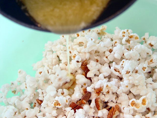 - Toss popcorn with the toasted chopped pecans and season with salt to taste. In a small sauce pan melt butter and honey until combined.