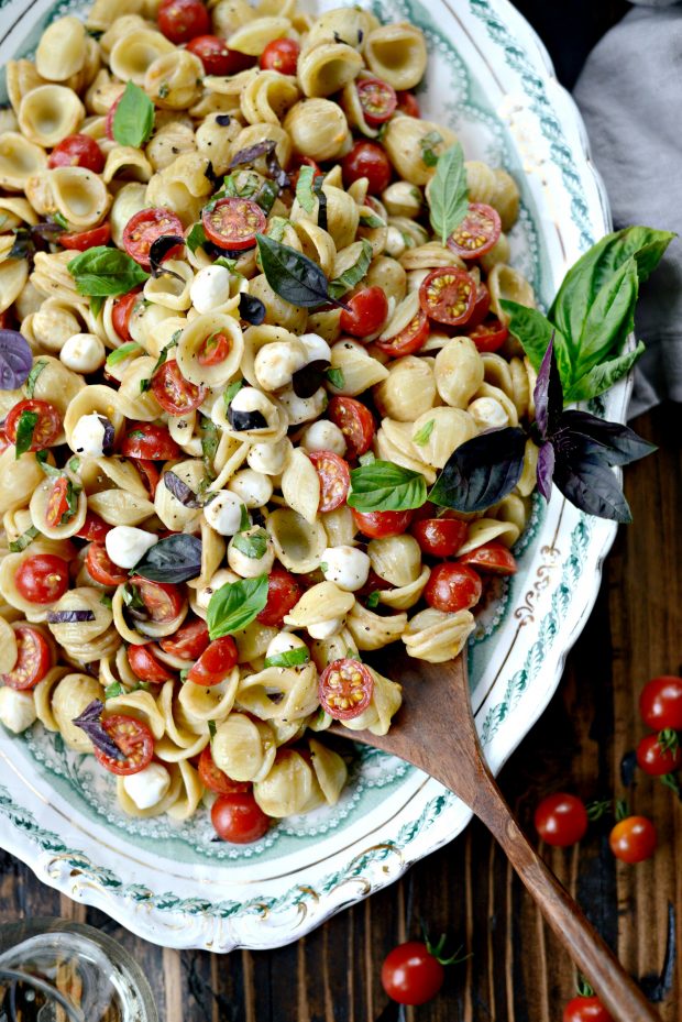 I have no words for how much I love this Caprese Pasta Salad. There’s this balance of acidic tomatoes, creamy fresh mozzarella, bright herbaceousness from fresh basil and it’s all tossed in a light balsamic vinaigrette. This salad is a crowd pleaser.