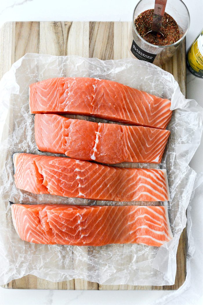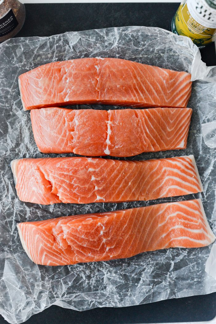 - Lightly mist your salmon with olive oil spray. Generously season the top and sides of each filet and lightly spray one last time.