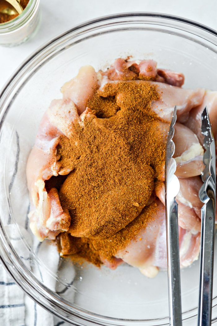 - Add boneless skinless chicken thighs to a large bowl and sprinkle kosher salt on both sides of each piece.
