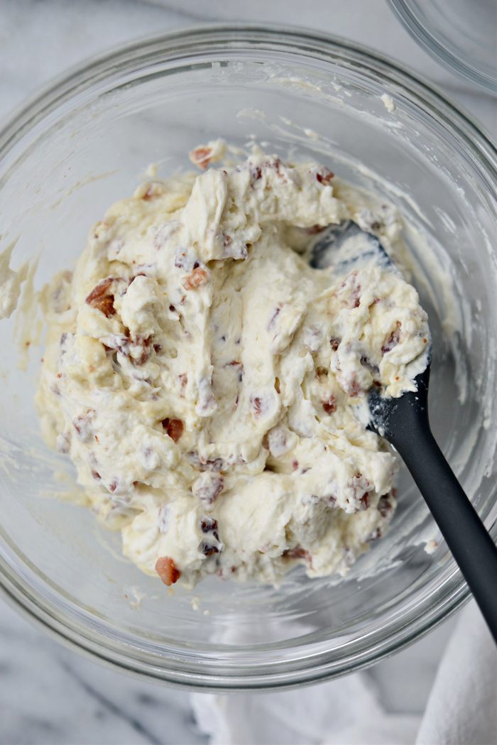 - In a medium mixing bowl, add whipped cream cheese, finely chopped bacon and maple syrup. Stir to combine.