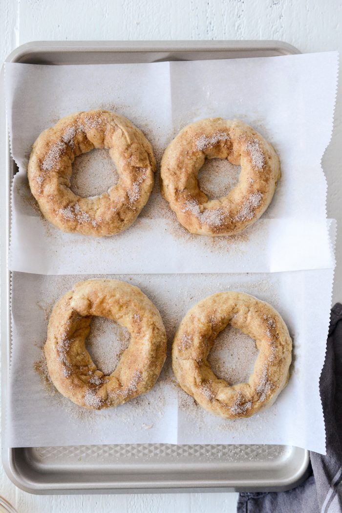 - Brush the bagels with egg wash and sprinkle with pumpkin spice sugar.