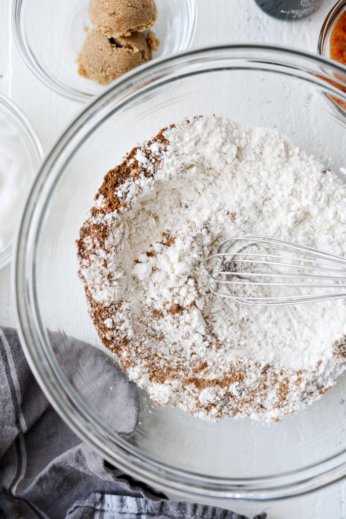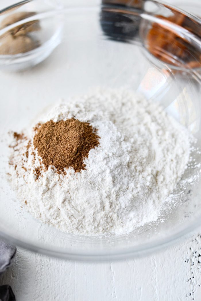 - In a medium mixing bowl, measure and add flour, baking powder, pumpkin spice and salt. Whisk to combine and set off to the side.