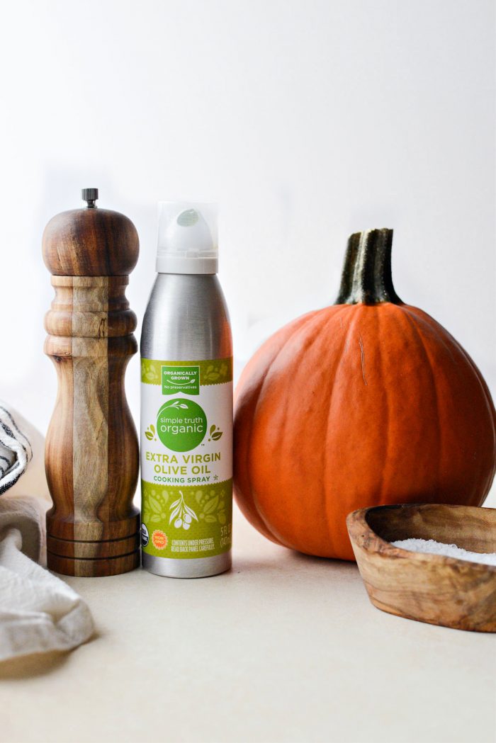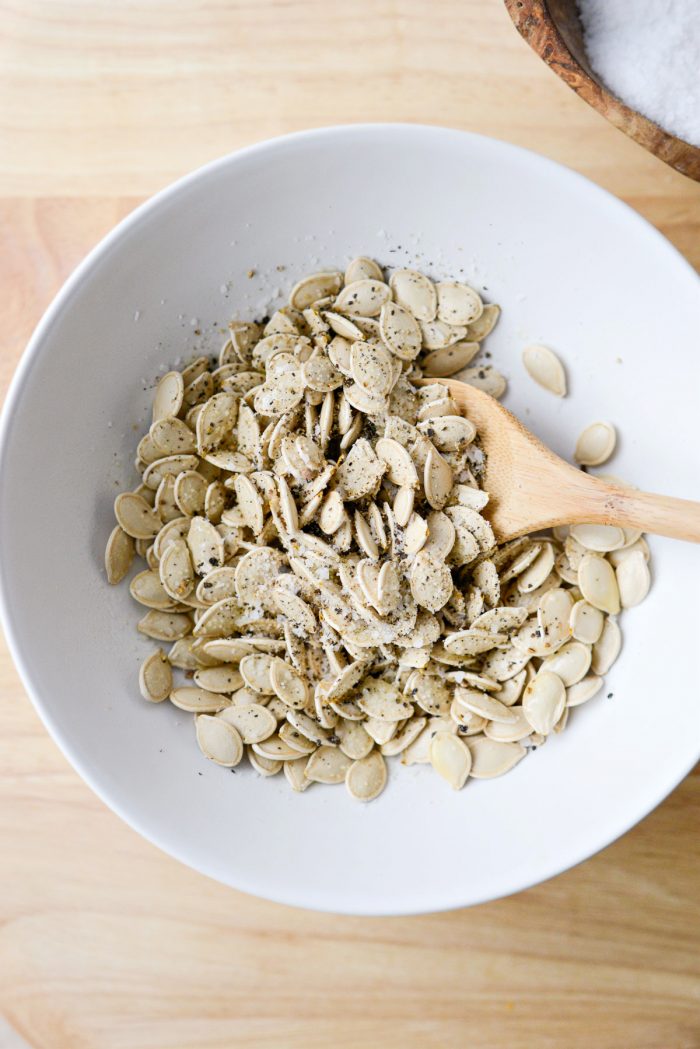 - Spray the dried pumpkin seeds with olive oil spray and season with kosher salt and freshly ground black pepper.