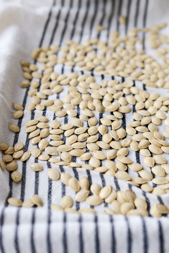 - Pat dry with paper towel and transfer to a sheet pan lined with a clean kitchen towel. Paper towel will eventually stick to the seeds and leave some lint stuck to them.