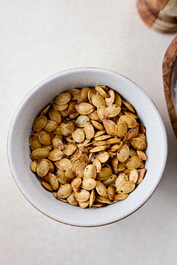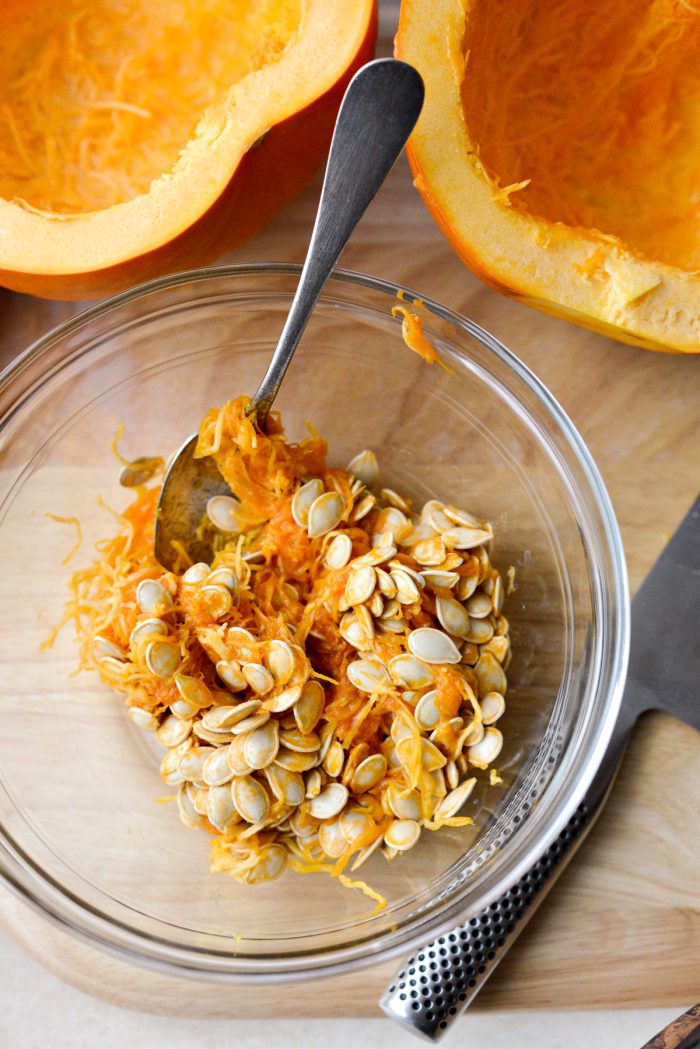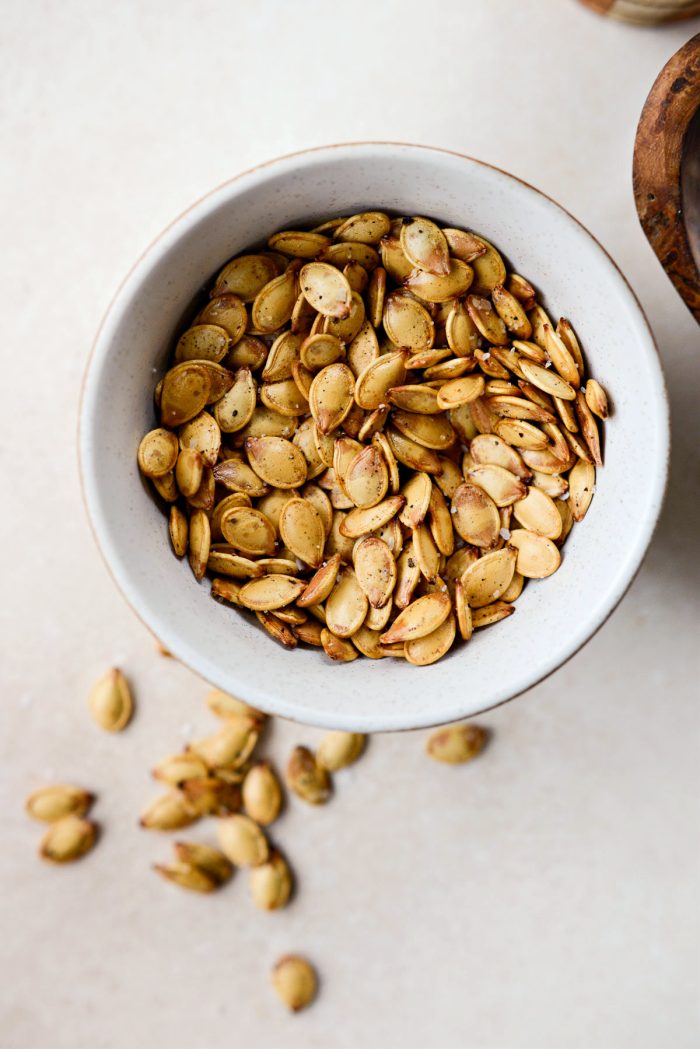 As a kid I remember sheet pans filled with pumpkin seeds and waiting for what felt like forever for them to roast in the oven. A tradition I carried on with my family. Sadly, now that my girls are older, they carve pumpkins with their boyfriends. However I make pumpkin puree or use pumpkin every fall in some form and I always save the seeds for toasting.