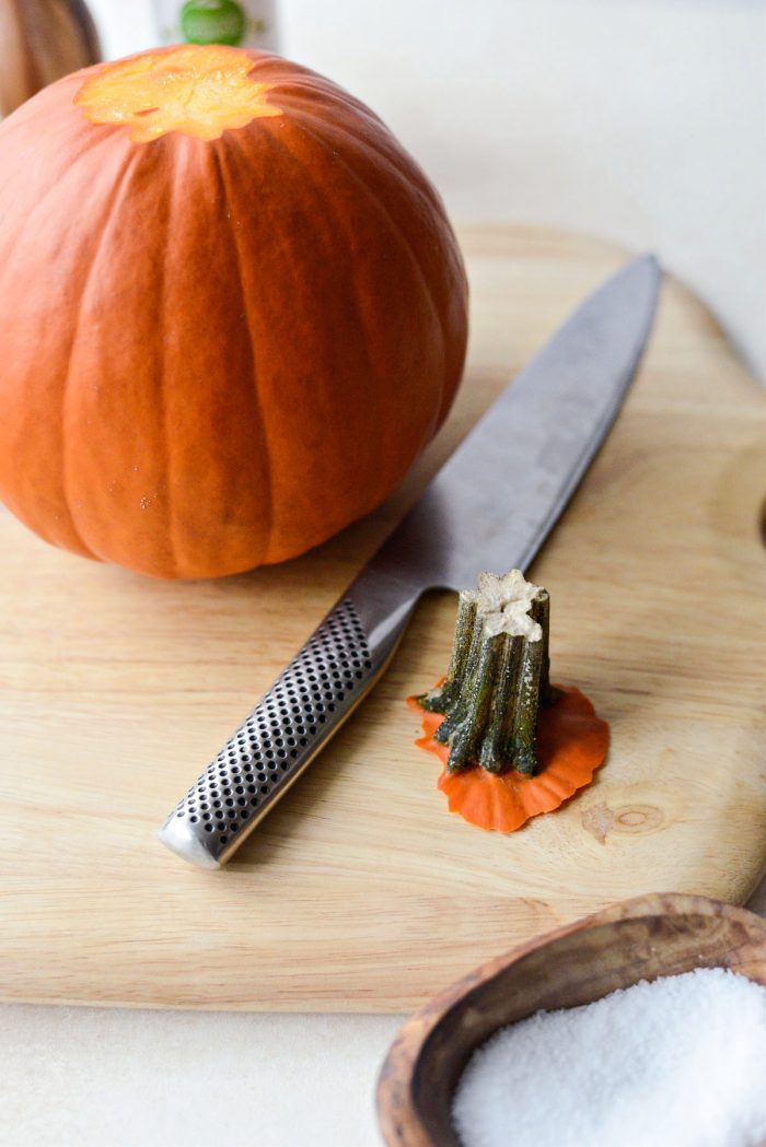 - Slice of the stem to your pumpkin and cut in half from top to bottom.