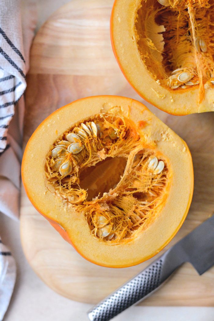 Trim the top of your pumpkin. I made a frittata and was using a pie pumpkin, however the seeds from a traditional carving pumpkins work too!