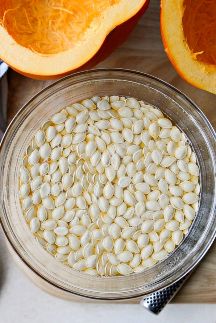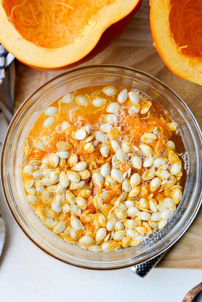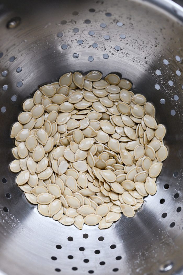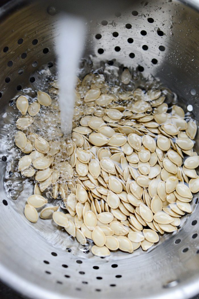 Then using a slotted spoon, scoop up the floating seeds and transfer to a colander. Rinse well with cold water. Discarding any pumpkin fibers.