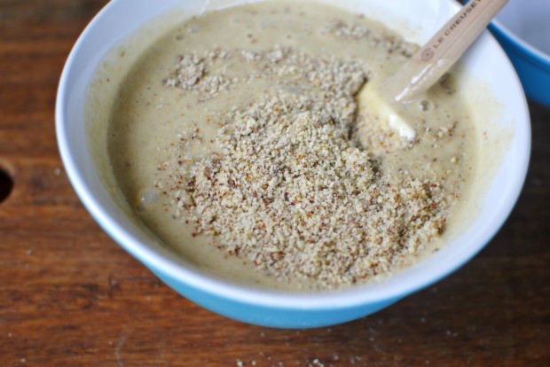 - Add the two eggs, sugar, bananas and cinnamon into the processor and blend until smooth like pancake batter. Pour the banana mixture into the bowl with the almond meal and stir until incorporated.