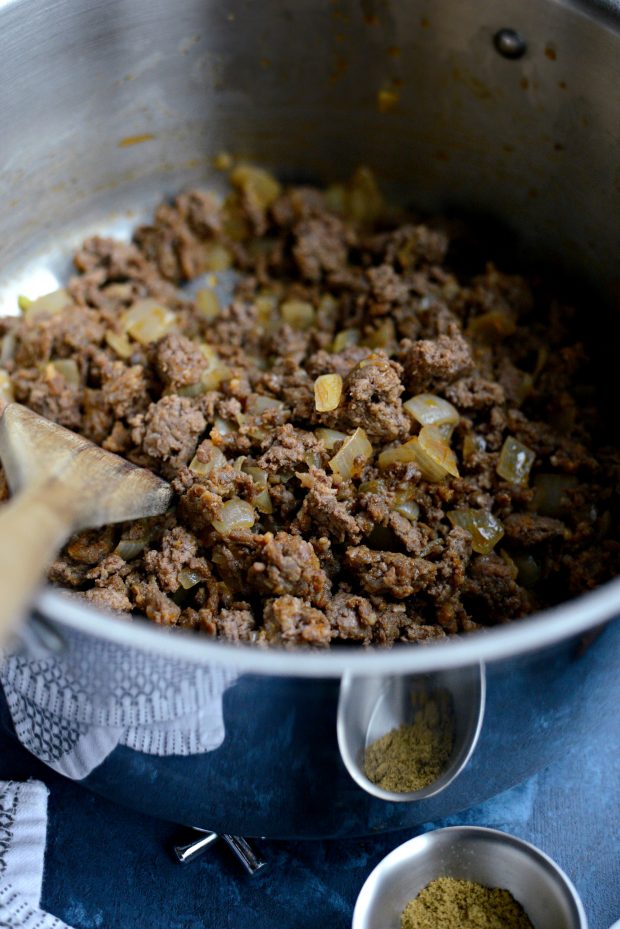 To that, add in 1 pound of both lean ground beef and chorizo. Cook, using a wooden spatula to break up the meat into small crumbles, for about 15 to 20 minutes or until no longer pink. Drain off any excess fat.