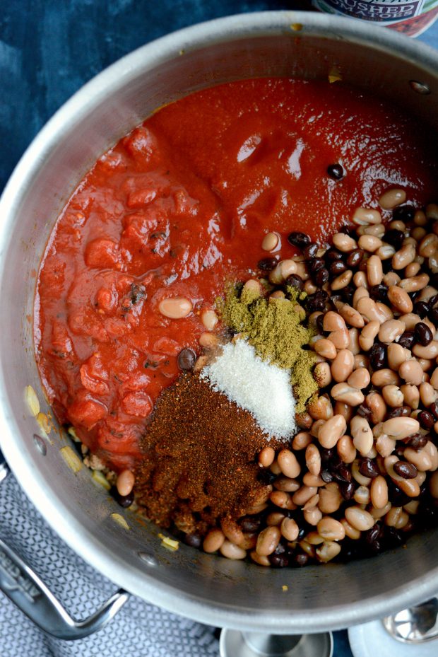 Add in 1 (28 ounce) can crushed fire roasted tomatoes, 1 (15 ounce) can tomato puree, 2 cans rinsed and drain pinto beans, 1 can (rinsed and drained) black beans, 3 tablespoons ancho chili powder, 1 rounded teaspoon ground cumin, 1 teaspoon sugar and 2 teaspoons kosher salt or to taste.