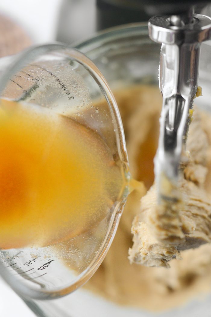 - While your mixer is on low speed, pour in the reduced apple cider, mixing until incorporated. The batter should not be overly thick.