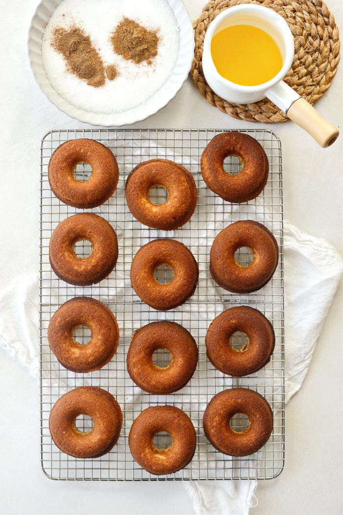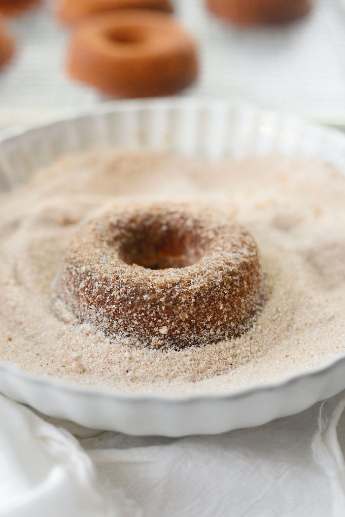 - Once the doughnuts have cooled, add the melted unsalted butter into a shallow bowl. In a separate bowl, add sugar, cinnamon and apple pie spice. Stir to combine. Dip both sides of the doughnuts in the melted butter, letting excess drip back into the bowl. Then transfer it to the bowl with the spiced sugar and coat on all sides. Repeat with the remaining doughnuts.