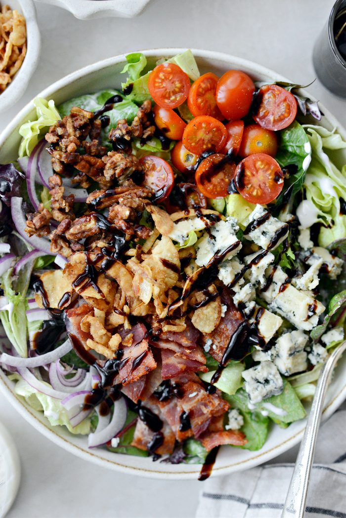 This Bacon and Blue Cheese Chop Salad is full of flavor. A mixed blend of lettuces are tossed in blue cheese dressing and topped with chopped cooked bacon, crumbled blue cheese, candied pecans, crispy fried onions and drizzled with balsamic glaze. Enjoy as is or top with sliced grilled chicken or protein of your choice. Yields 4 servings.