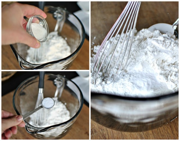 - Meanwhile in a medium bowl whisk together the flour, sugar, baking powder, salt and baking soda. Set aside.