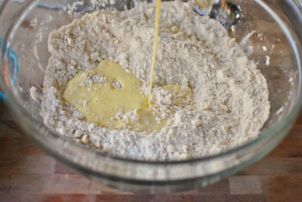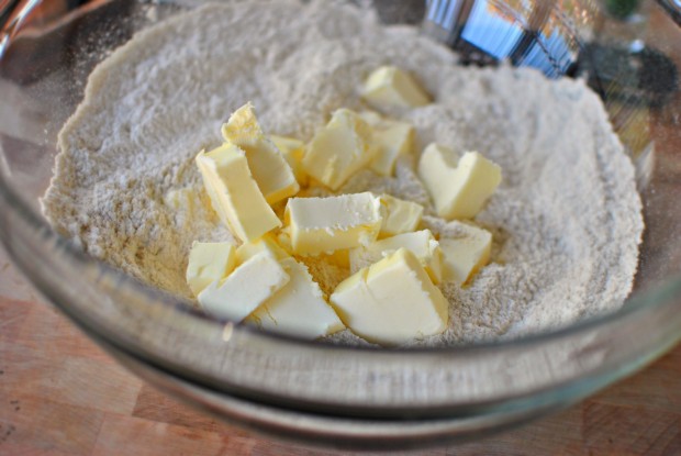 - In a large bowl combine the flours, sugar, baking powder and salt. Drop in the cold butter and using a pastry cutter, cut the butter into the flour mixture until it resembles coarse, wet sand.