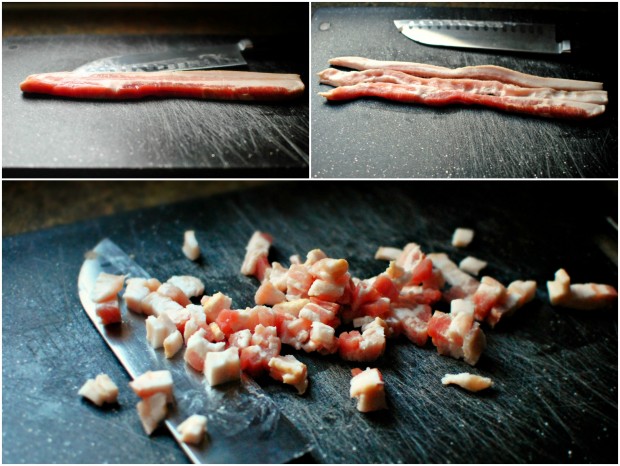 Start by slicing the bacon into thirds lengthwise and then dice them up pretty small.