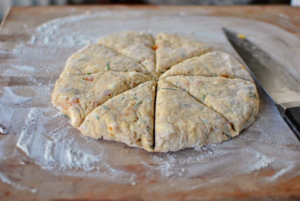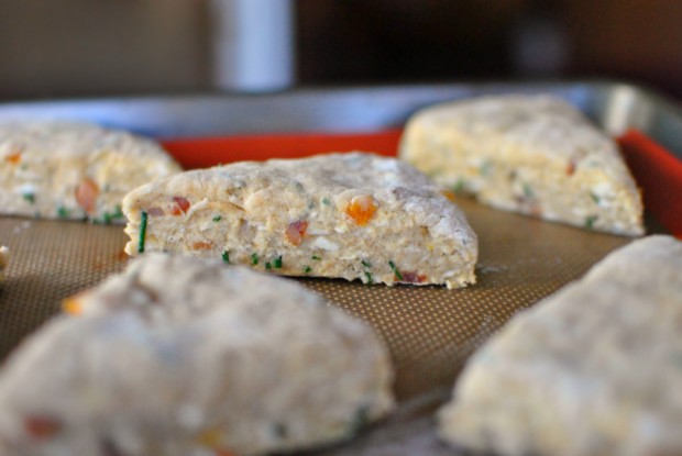 Arrange the bacon, apricot and gorgonzola scones onto a lined, rimmed baking sheet and pop them into your preheated 400 degree oven to bake for 15-18 minutes or until the tops are golden.