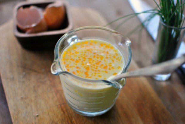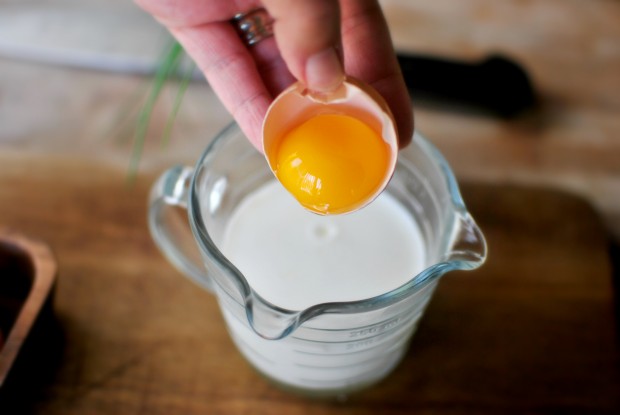 - Combine the two eggs and the 1/2 cup of milk in a small bowl or measuring cup and keep cold in the fridge.