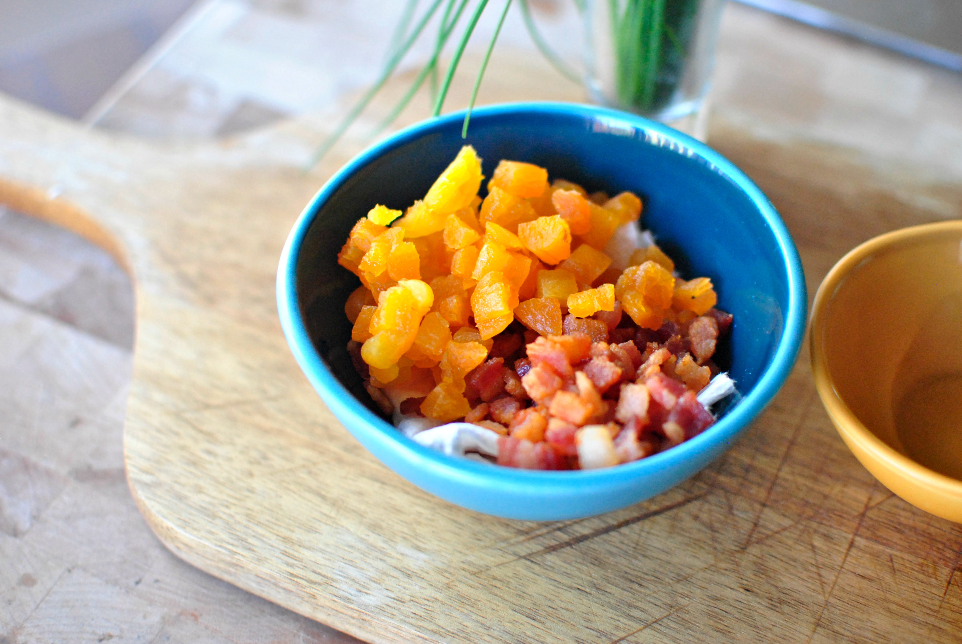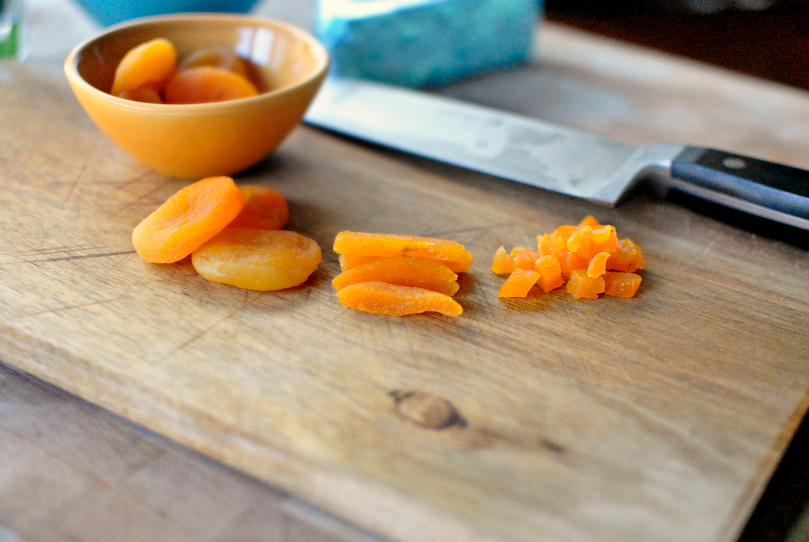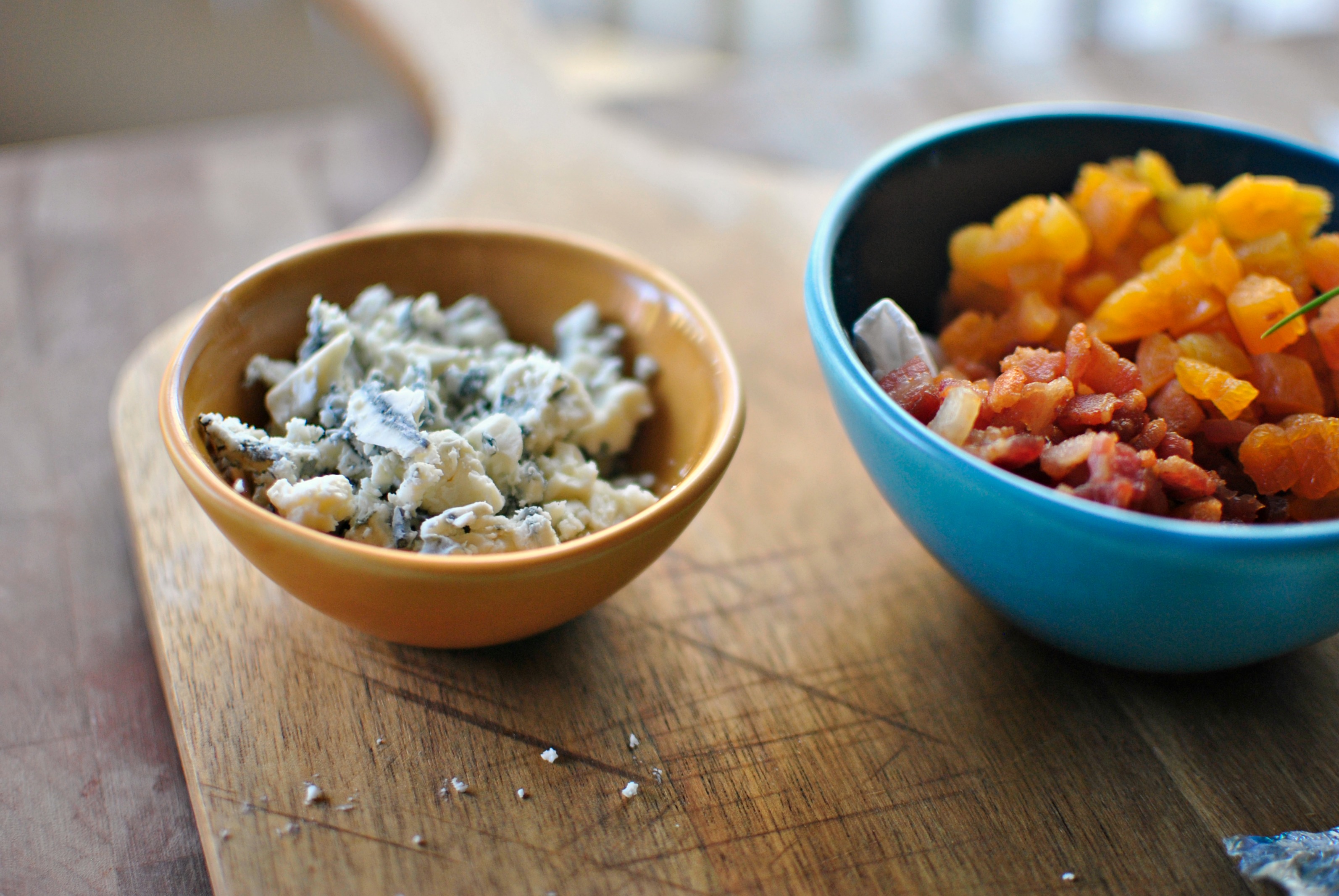 - Slice the bacon lengthwise into thirds and then dice. Cook the diced bacon in a skillet until crispy. Drain on paper towel. Combine the diced apricots with the crispy bacon pieces and refrigerate.
