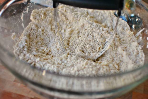 Use a pastry cutter and blend the butter into the flour until small crumbles form. I’ve found this to be the easiest way to do it, you can try two forks… but you’re arms will be screaming by the end.
