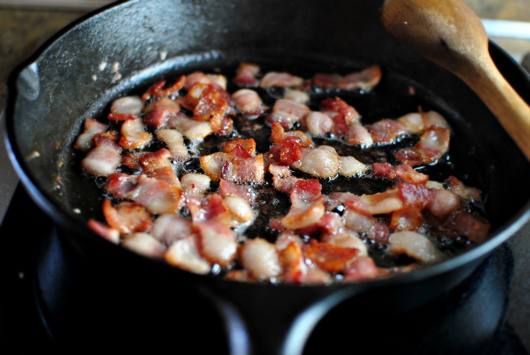 - Add the diced bacon into a skillet and heat over medium. Stir occasionally until crispy. Use a slotted spoon to remove the bacon to a paper towel lined plate. Drain off all but a tablespoon of fat.