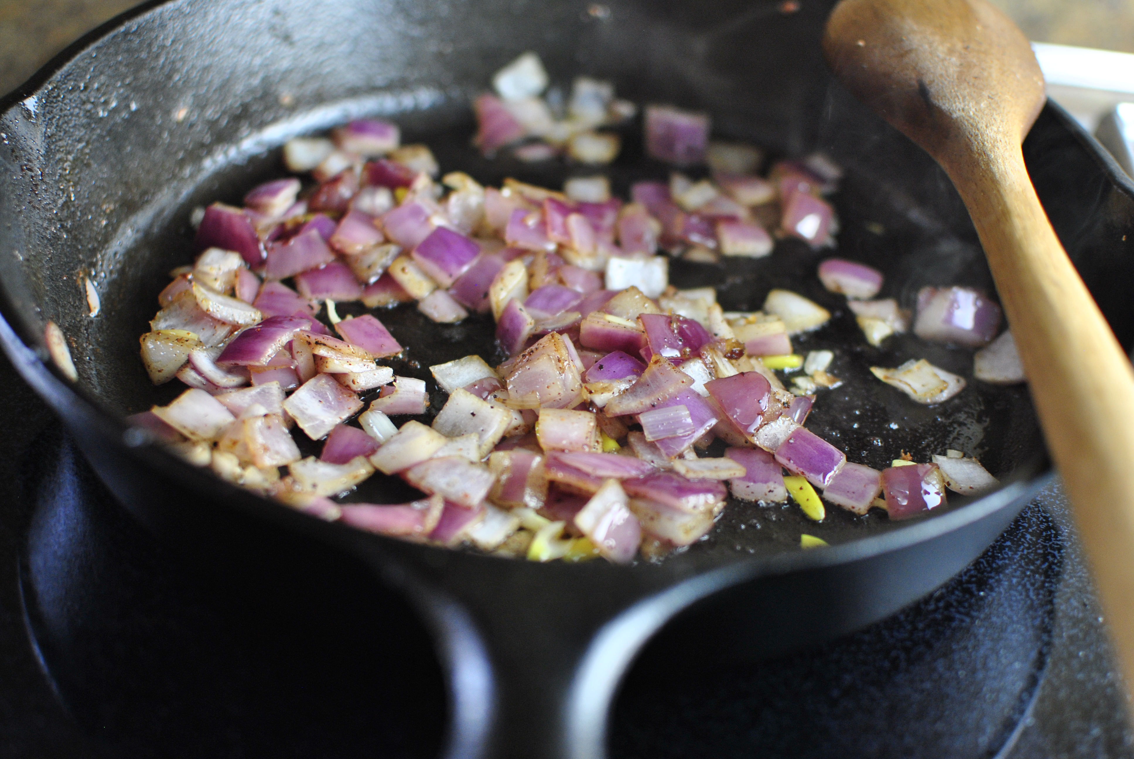 - Add the diced red onion to the skillet and cook until soft. About 5 minutes. Add in the garlic and cook for one minute.