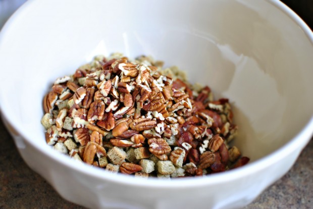 - In a large bowl combine the stuffing mix, crispy bacon and chopped pecans.