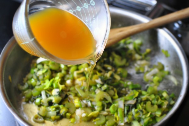 - Drain off all but two tablespoons of fat/oil and add in the sliced celery and leeks. Season with salt and black pepper and cook until the leeks are soft and somewhat translucent.