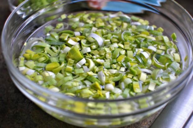 Then just swoosh them in a large bowl filled with cold water to release any sandy dirt. It will fall to the bottom of the bowl while the leeks float on top.