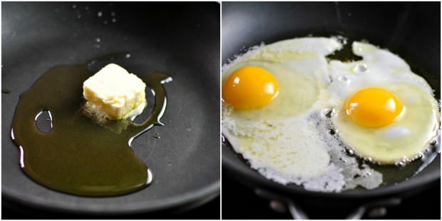 - In the meantime fry up the eggs in a hot skillet with 1 tablespoon of both olive oil and butter. Cover with a lid until the whites are set but the yolk is still runny.