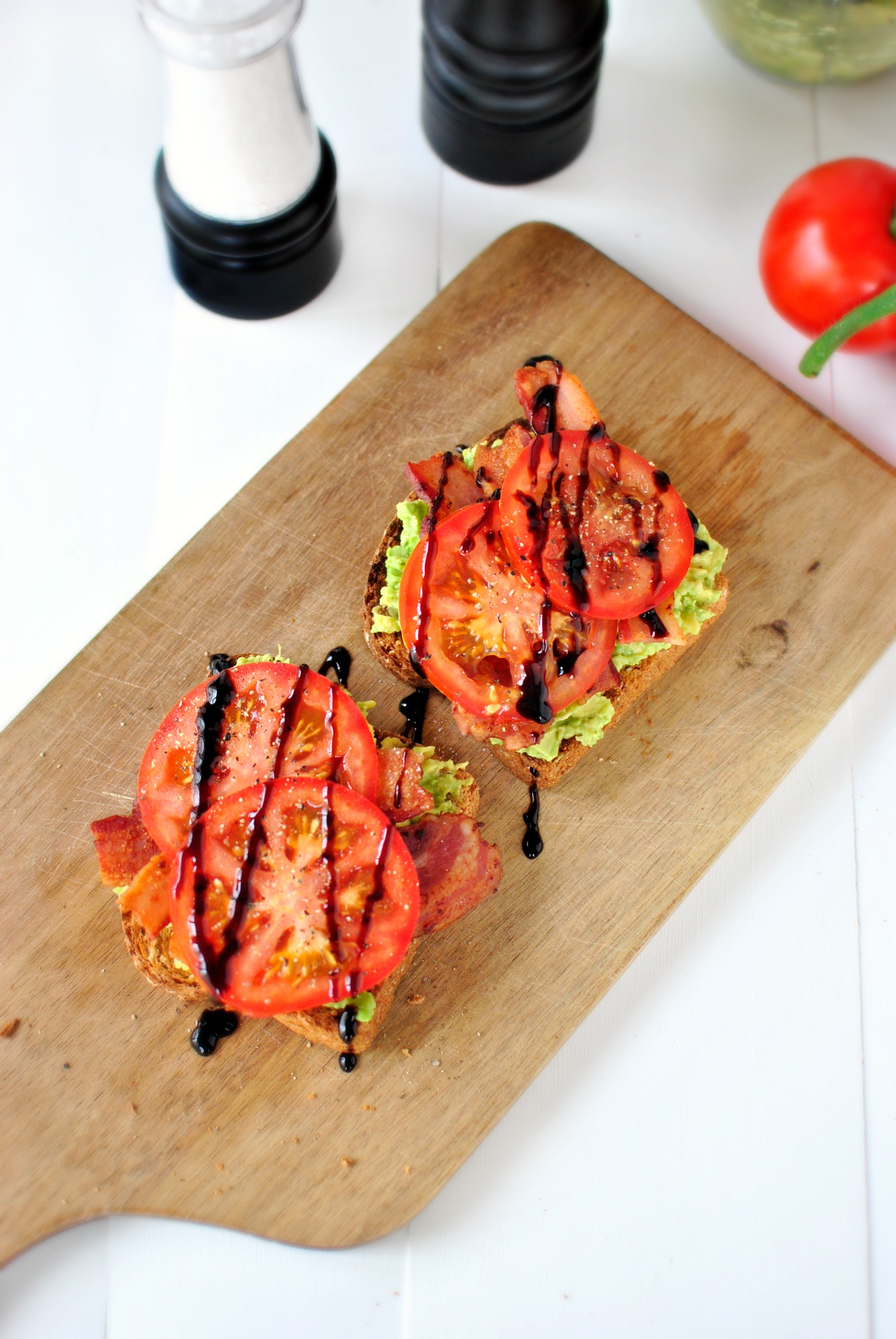 Toast topped an inch thick with smashed fresh avocado, crispy bacon, ripe tomatoes and drizzled with a thick, glossy balsamic reduction. I’ve got a crush on an open-faced BLT, minus the L, because the lettuce just gets in the way. I was close to calling these a B-A-T sandwich, replacing the L [lettuce] with the A [avocado] but then I imagined people saying “bat” sandwich, and well you can see where it would be a bad idea right?