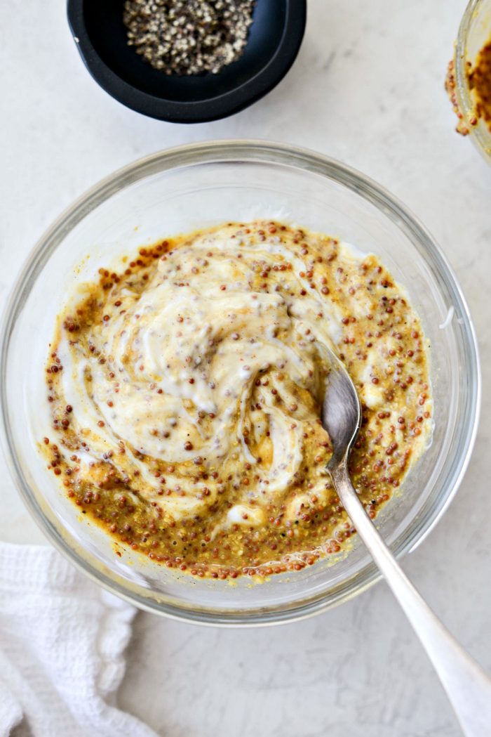 In a small bowl combine the 3 tablespoons each of plain nonfat greek yogurt and 3 tablespoons mayonnaise with 1/4 cup stone ground mustard. I love and have been using Inglehoffer for years. This isn’t sponsored, just keeping it real.