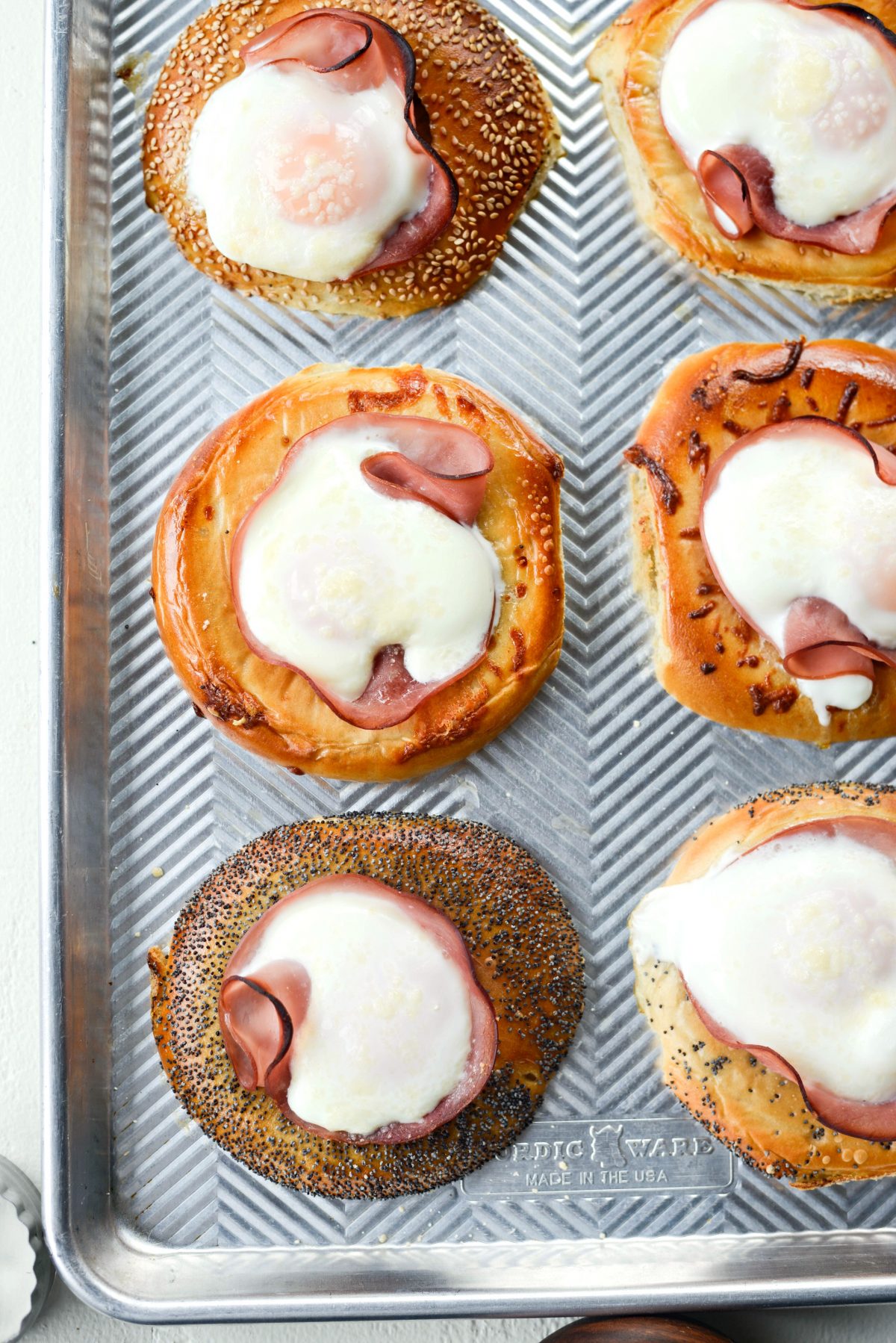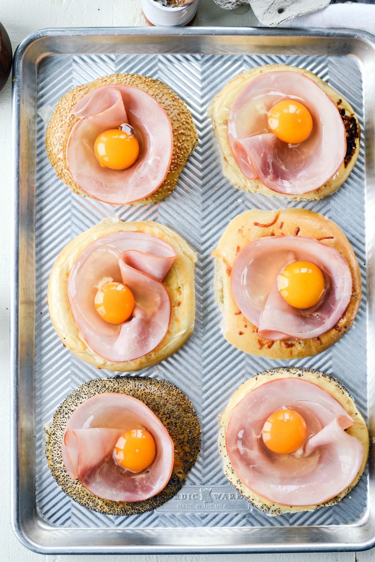 These Baked Egg in a Hole Bagels are an easy fun recipe that anyone can make! A simple sheet pan breakfast of bakery bagels, smoked ham and eggs. Perfect for a lazy weekend breakfast or brunch. Serves 6 in 20 minutes.