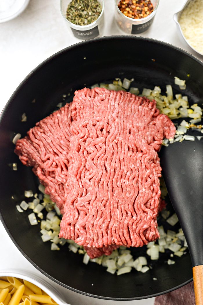 - Next add in the ground beef and cook over medium heat, using a spatula to break up the meat. Cook until browned and no longer pink. About 15 minutes