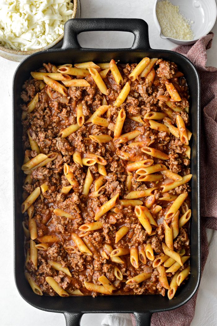 Transfer the pasta/meat mixture into a 9×13 oven safe baking dish.
