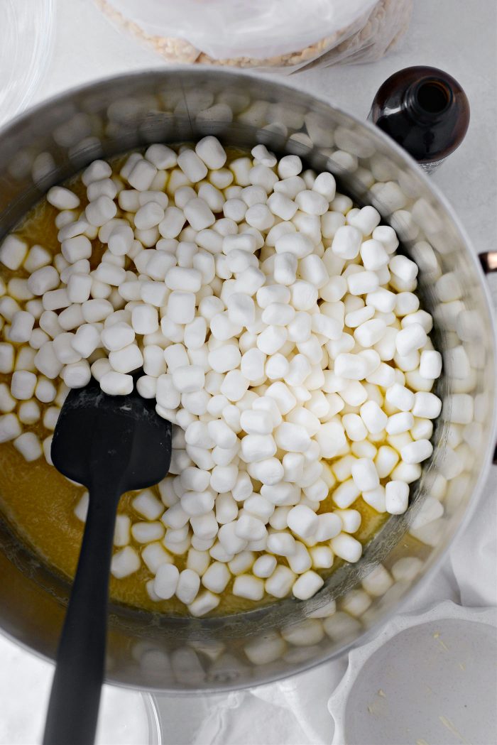 - In a large pot, melt the butter over low heat. Once melted, use a rubber spatula to stir in the sweetened condensed milk. Add in 10 ounces of mini marshmallows and stir while they slowly melt.