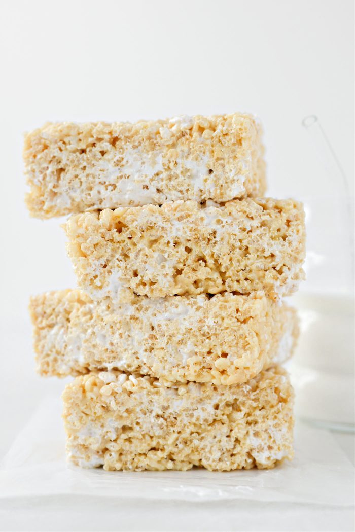I had my first rice krispie treat when my husband and I were newly dating as teenagers, and I’ve loved them ever since. However, once you’ve had a bakery style version there’s really no going back. The difference? Is by adding in sweetened condensed milk you will get soft and ultra gooey krispie treats with incredible flavor but without making them overly sweet. I also swirl in marshmallow fluff which adds ribbons of soft sweet marshmallow throughout. To. Die. For.