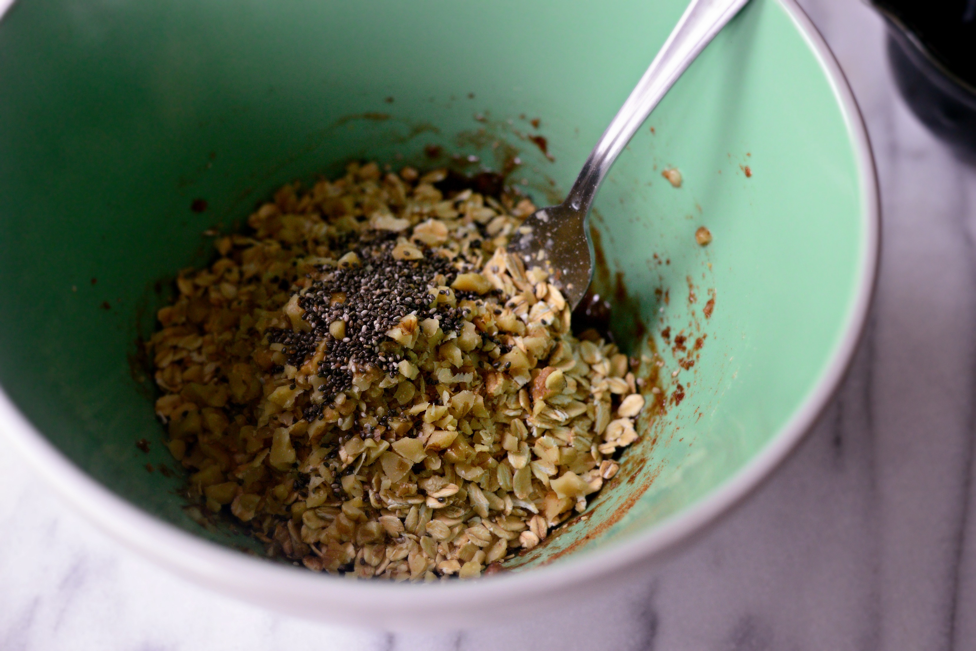 Then add in the 1/2 cup of thick-cut oats, 1/4 cup chopped walnuts and the teaspoon of chia seeds.