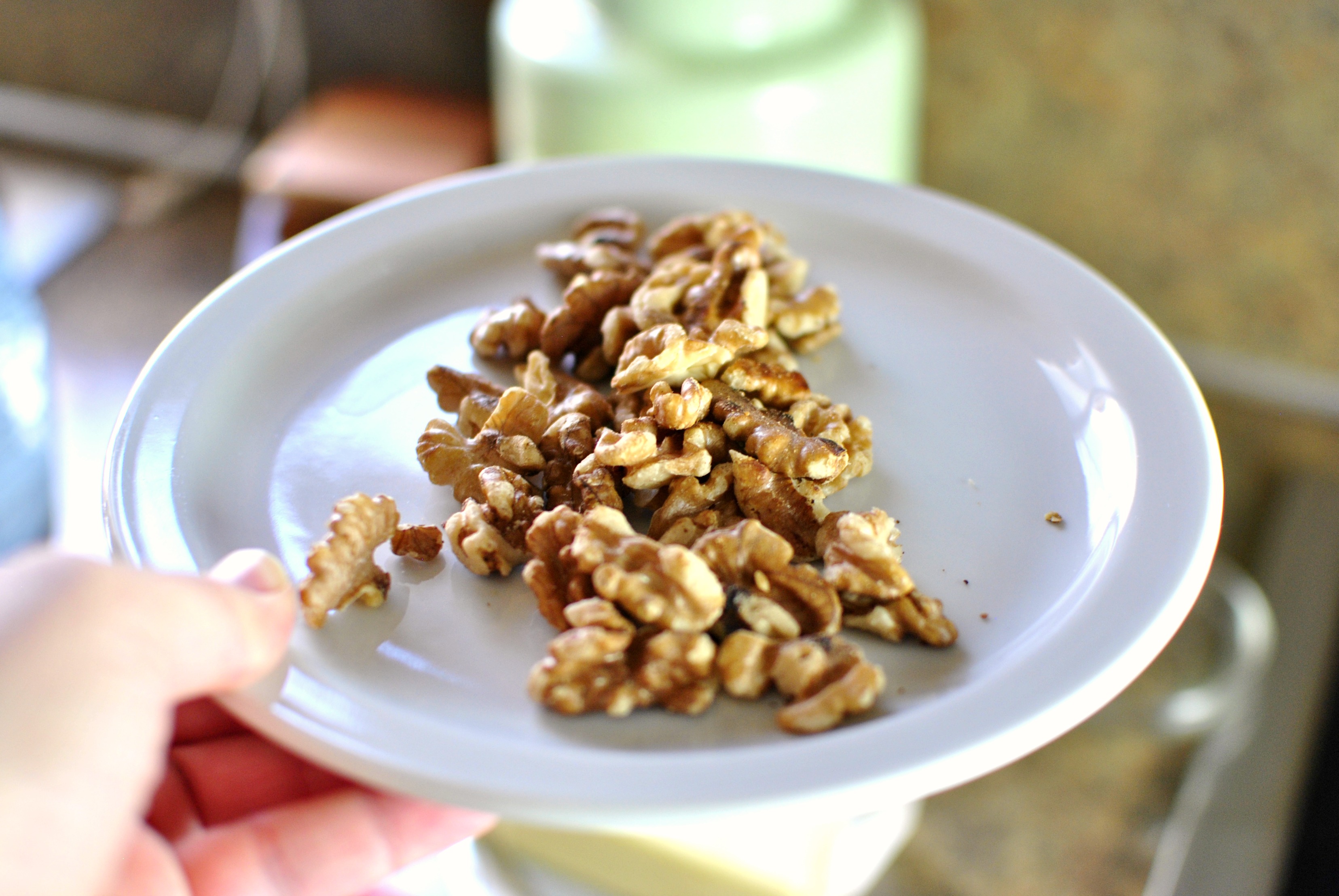 Once you start smelling the warm and toasty walnuts, remove them to a plate.