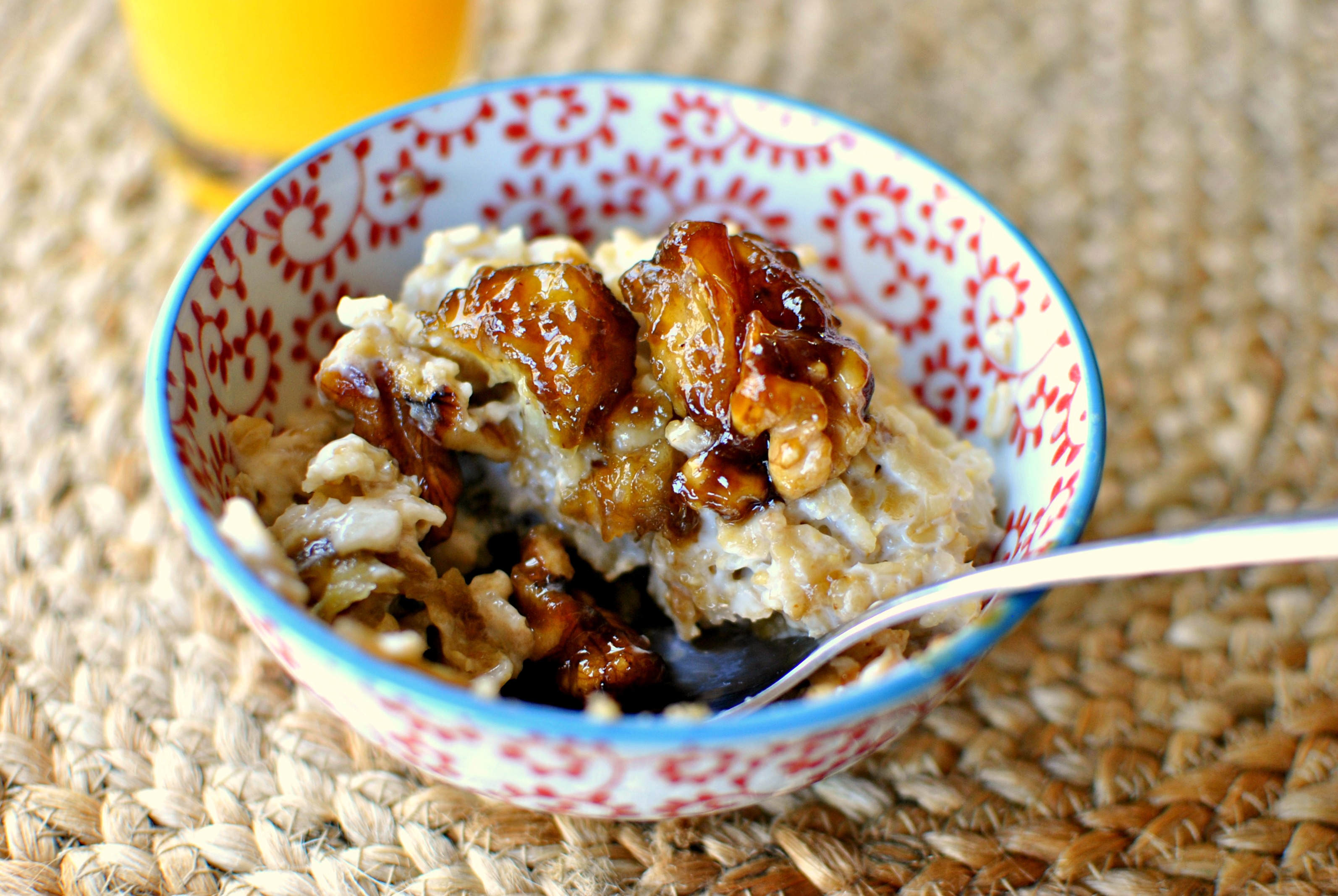 I often have bananas in my oatmeal, but never quite like this, looks delicious. Like the idea of adding walnuts too, gives that bit or protein to really keep you going all morning.