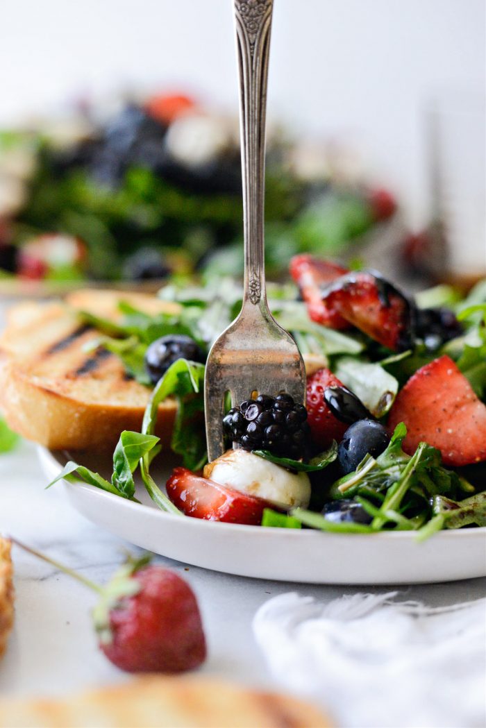 This is such a simple salad that’s perfect for those last minute throw together meals! The fresh berries with the burst of fresh herbs, creamy mozzarella and tangy sweet glaze is ridiculously good!