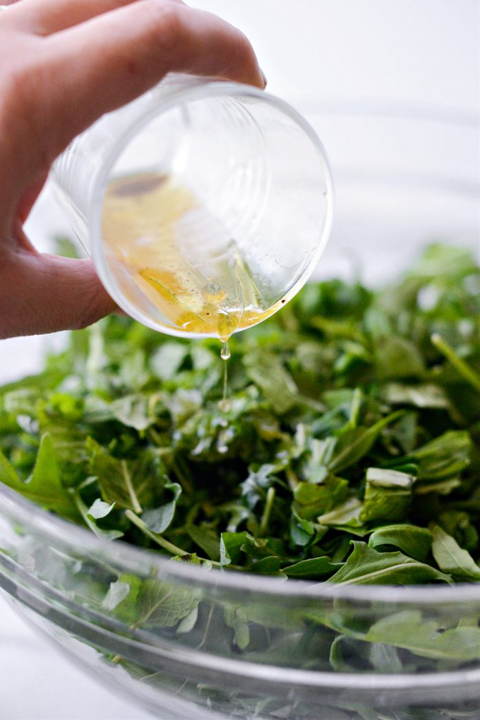- Add arugula, basil and mint into a large bowl. Drizzle with dressing and toss well to coat.Transfer dressed arugula to a large platter or individual serving plates.