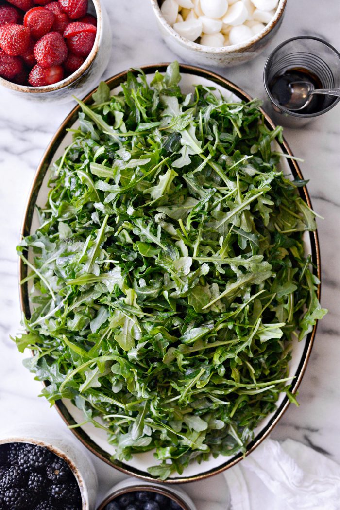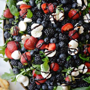 Berry Caprese Salad is stunning, festive and a fun take on a classic! Peppery arugula and fresh herbs are lightly dressed and topped with berries, mozzarella and drizzled with balsamic glaze. Serves 4 to 8+ depending.