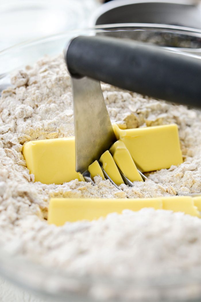 - Add in the cold butter and use a pastry blender to cut the butter into the dry ingredients until you get a coarse crumb. Reserve 1½ cups of this crumb mixture and refrigerate until ready to serve.