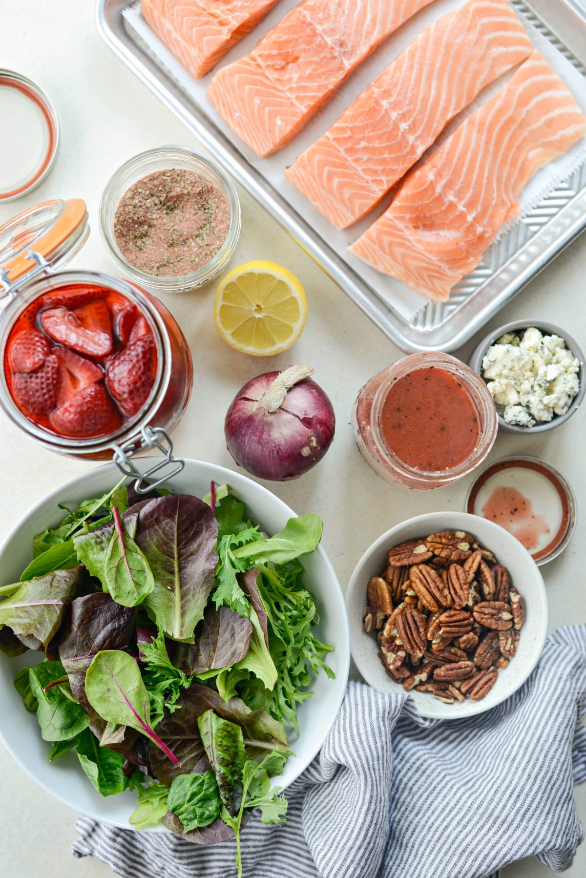 - While the salmon cools, divide the salad greens, onions, blue cheese, pecans and pickled strawberries among plates.