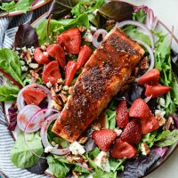 Fast forward a few months, and although blackened chicken is delish, I really wanted to try this salad with blackened salmon. I don’t eat nor blog enough salmon so here is the final masterpiece and believe me it doesn’t disappoint. There’s some spice from the baked blackened salmon, sweetness in thanks to the strawberry peppercorn jam vinaigrette, tang from the pickled strawberries and well you can probably imagine how delicious the blue cheese and toasted pecans are.
