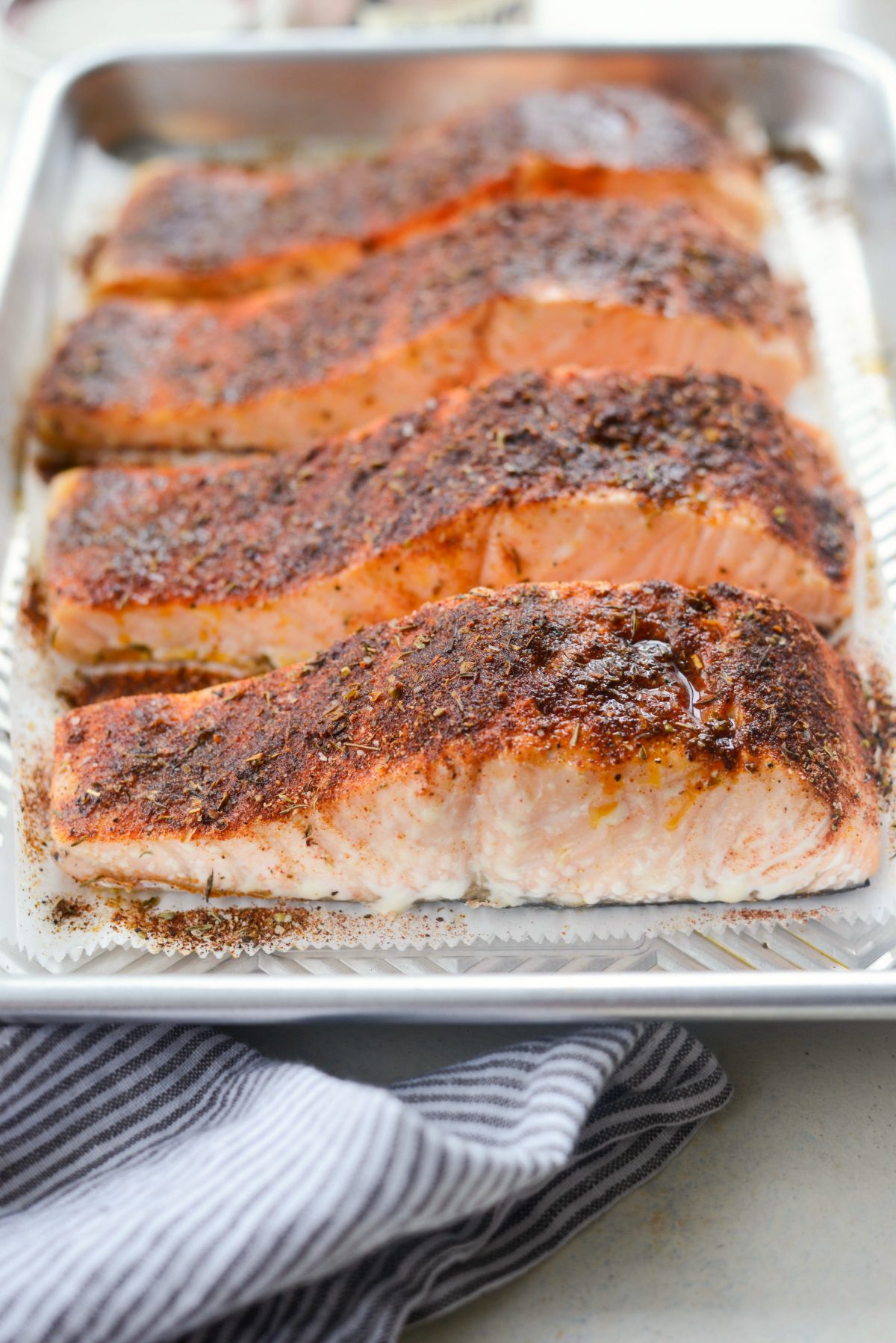 Next, for the baked blackened salmon, you will want to first blot your salmon dry with paper towel. Then spray lightly with olive oil and season with 1 teaspoon blackened seasoning per filet. Bake in your preheated oven for 12 to 14 minutes, give or take depending on the size and thickness of your salmon.