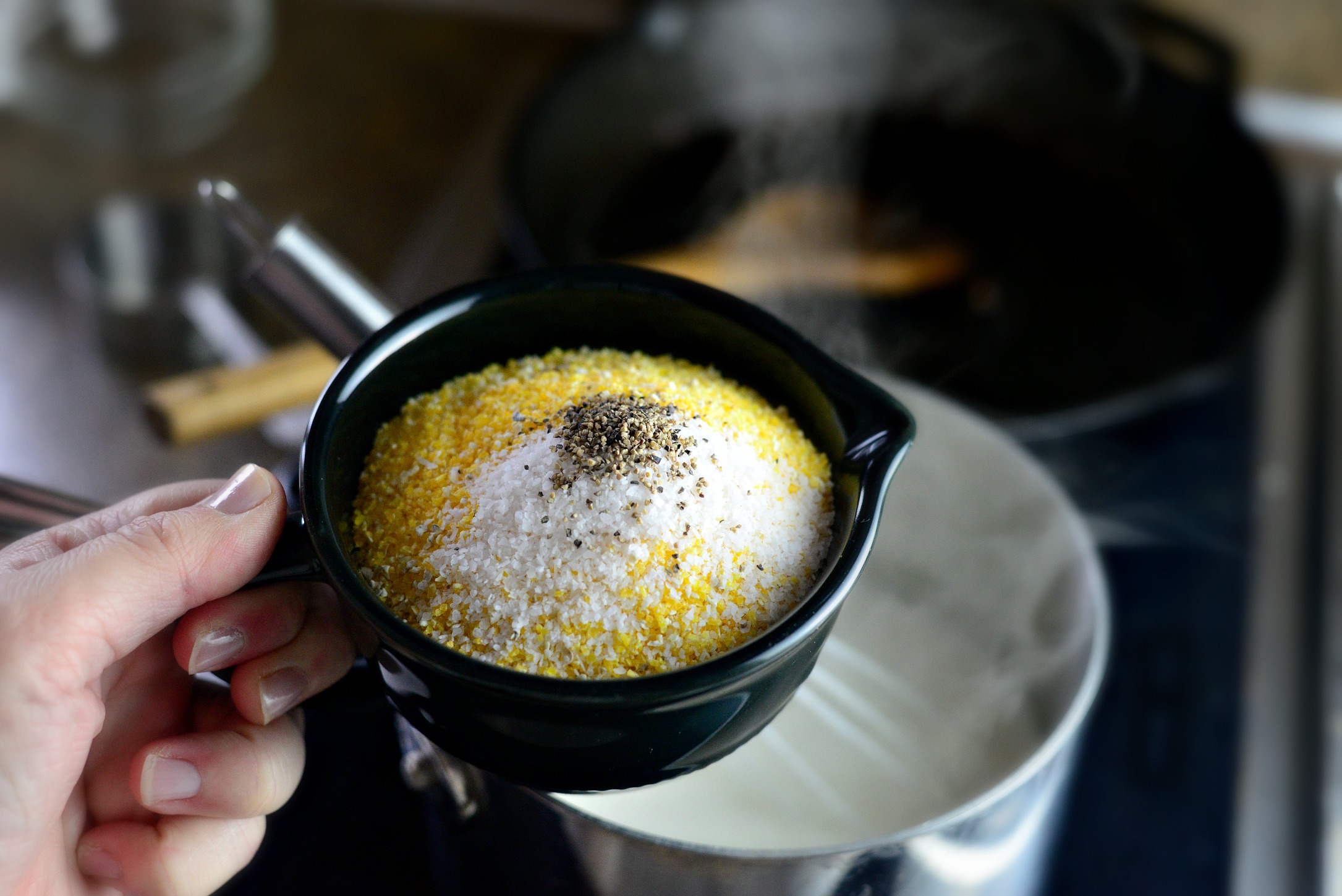 Reduce the temp to medium or medium-low and pour in the polenta, salt and pepper while whisking.
